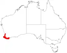 It occurs along the edges of creeks and streams and around swamps from the Perth region south through the Margaret River region and eastwards to Albany where it grows in sandy or loamy soils.[1]