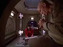 The firestorm itself was created by Dan Curry and Ronald B. Moore by pouring liquid nitrogen onto black velvet and then blowing it with an air hose. The effect was then enhanced by digital effects and was digitally inserted into the background of the exterior standing set (usually referred to by cast and crew as "planet hell").[2] "Lessons" was the first appearance of the stellar cartography on board the Enterprise, but the set would be completely replaced for its reappearance in the movie Star Trek Generations.[3]