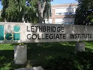 Lethbridge Collegiate Institute (LCI) is a public high school in Lethbridge, Alberta, Canada, operated by Lethbridge School District No. 51 that serves grades nine through twelve. LCI was the first school in Lethbridge designated only for secondary students. It opened at its current location in 1950, but was founded in a smaller, adjacent building in 1928. Since its 1950 opening, several additions and layout changes have been made at the school. In August 2010, Chinook High School opened in West Lethbridge with over 700 students enrolled.[3] Those that entered grade 11 in 2009 at LCI were permitted to complete their graduating year at LCI, but west Lethbridge students are now encouraged to attend the new high school, which was being built in conjunction with a western campus of Catholic Central High School, recreational facilities,[4] and a public library. [5][6]