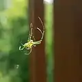 Leucauge venusta, known as the orchard orbweaver spider, is a long-jawed orbweaver spider that occurs from southern Canada to Colombia, along the East coast, reaching into the central US, also in South Asia. The web is often oriented horizontally, with the spider hanging down in the center.