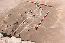 → The latest investigations[15] in Sector 18 have revealed a more complex and multifaceted panorama, and a new closed context, this one destroyed in the 2nd century BC, which seems to correspond to a cult building.[3] From this place comes the exceptional vase of the "Goddess and the Iberian prince",[16][17][18][19] which has recently been added to the permanent collection of the museum of Lezuza.[20]