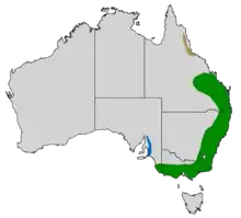 The yellow-faced honeyeater ranges across a broad arc generally along the coastline from near Cooktown in Far North Queensland, and between a line from Charters Towers south to Albury and the coast, and then west to the Fleurieu Peninsula and the Mount Lofty Ranges in South Australia. Population densities have been recorded from 0.01 birds per hectare (2.5 acres) near Armidale in New South Wales to 7.8 birds per hectare at Tarnagulla, Victoria. During the winter months of June and July, numbers are generally lower in Victoria and higher in Queensland, following their northward migration.[19]
