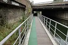 In 1849 James Rendel was asked to devise a scheme to improve the infrastructure, which was dilapidated. He reported that "if [the Navigation] is to compete successfully with Railways, it should be made an efficient branch of the Thames, viz. navigable by the largest class of barges there employed".[24] He proposed, besides numerous improvements on the river proper, the reconstruction of Bromley Lock; deepening the Limehouse Cut; forming a towing path under Britannia Bridge (Commercial Road); and the construction of a new outfall lock into the Thames, with cills 19 feet below Trinity High Water, and with tide gates.[25]