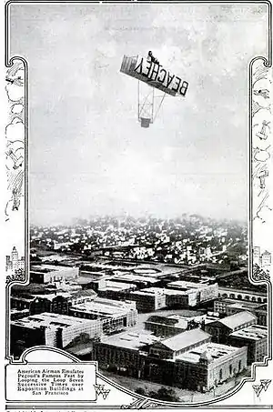 In 1912, Beachey, Parmelee, and aviation pioneer Glenn Martin performed the first night flights in California with acetylene burners, fuses, and small noise making bombs dropped over Los Angeles.[11] In 1913, Beachey took off inside the Machinery Palace on the Exposition grounds at the San Francisco World's Fair. He flew the plane at 60 miles per hour (97 km/h) and landed it, all inside the confines of the hall. His stunt speciality was the "dip-of-death", where he would take his plane up to 5,000 feet (1,500 m), and dive toward the ground at full speed with his hands outstretched. At the last moment he would level the plane and zoom down the raceway, with his hands off of the controls, gripping the control stick with his knees. In a jest aimed at Blanche Stuart Scott, another member of the Curtiss exhibition team, Beachey dressed up as a woman and pretended to be out of control in a mock terror to hundreds of thousands.[12]