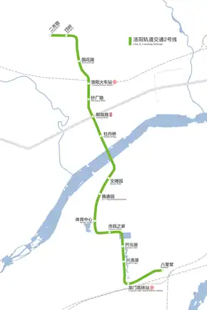 Line 2 of Luoyang Subway (Chinese: 洛阳轨道交通2号线) is the second metro line to open in Luoyang, Henan, China, which opened on 26 December 2021.[1] The line is currently 18.216 km (11.319 mi) long with 15 stations.[2]
