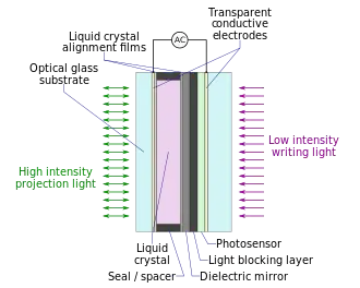The Hughes liquid crystal light valve (LCLV) was designed to modulate a high-intensity light beam using a weaker light source, conceptually similar to how an amplifier increases the amplitude of an electrical signal, and named after the common name for the triode vacuum tube.[1] A high-resolution, low-intensity light source (typically a CRT) was used to "write" an image in the CdS photosensor layer; transparent indium tin oxide electrodes are driven by an alternating current source to transfer that image to the liquid crystal layer. A light-blocking layer prevents the low-intensity writing light from shining through the device. On the other side, a high-intensity projection light source reflects selectively from the dielectric mirror based on the liquid crystal being controlled by the photosensor. The dielectric mirror is formed by sputtering layers of TiO