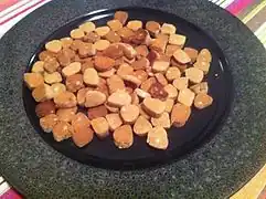 Nuts (usually almonds) that have been spiced and candied so they end up coated in a layer of caramelized, crunchy sugar |