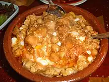 Tajine North Africa A Maghrebi dish from North Africa, that is named after the special earthenware pot in which it is cooked. A similar dish, known as tavvas, is found in the cuisine of Cyprus. The traditional tajine pot is formed entirely of a heavy clay, which is sometimes painted or glazed. Tajines in Moroccan cuisine are slow-cooked stews braised at low temperatures, resulting in tender meat with aromatic vegetables and sauce.