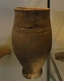 Romano-British Pottery was produced from the 1st through the 5th centuries AD in Britain, during the period of occupation by the Roman Empire.[1] Before the invasion of the Romans, pottery in Britain was handmade and fired in a bonfire. The Romans introduced the new technology of fast potters wheels and kilns for firing. The newer manufacturing methods resulted in a pottery that was different from the previous period's pottery. Romano-British pottery has a thinner, harder and smoother fabric than both Iron Age (800 BC–100 AD) and Anglo-Saxon pottery (500–1066 AD).[2]