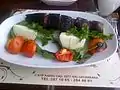 Skewers consisting of pork, chicken or lamb that is barbecued.[6][7] Pictured is a souvlaki platter. |