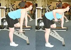 • The bent-over row is performed while leaning over, holding a weight hanging down in one hand or both hands, by pulling it up towards the abdomen. This is a compound exercise that also involves the biceps, forearms, traps, and the rear deltoids. The torso is unsupported in some variants of this exercise, in which case lifting belts are often used to help support the lower back.