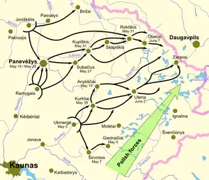 On May 18, the reorganized army carried out its first operation. The Vilkmergė Group captured Kurkliai and Anykščiai.[65] On May 22, the Group launched an attack on Utena. The initiative was met by a Soviet counterattack and the Lithuanian forces retreated. Further attacks were stopped for several days to wait for the results of the advance on Kupiškis.[66] The drive towards Utena resumed on May 31, and the city was secured on June 2. The Panevėžys Group launched a drive towards Panevėžys on May 18 and secured the city the following day, but lost it to a Bolshevik counterattack, carried out on May 21.[32] However, the Soviets left Panevėžys without a fight two days later.[67] The Group charged towards Kupiškis and secured Subačius. On May 30, Joniškėlis' partisans broke through the Soviet lines and liberated Rokiškis in Soviet rear;[68] Bolshevik forces, afraid that they could be encircled, left Kupiškis on the night of May 30–31, and Lithuania secured that city on June 1.[69]
