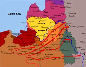 Red Army captured one town after another: Zarasai and Švenčionys (Dec. 22), Utena (Dec. 23), Rokiškis and Vilnius[33] (Jan. 5), Ukmergė and Panevėžys (Jan. 9), Šiauliai (Jan. 15), Telšiai (Jan. 25).[30] That accounted for about 2⁄3 of the Lithuanian territory. The front somewhat stabilized when Soviet forces were stopped near the Venta River by Latvian and German units (Baltische Landeswehr).[34] Also, Germans slowed down the withdrawal of their troops after the Spartacist uprising was subdued on January 12.[35] Southern Lithuania was a little better protected as Germans retreated from Ukraine through Gardinas. To prevent fights between retreating Germans and the Red Army, the Soviets and Germans signed a treaty on January 18. The treaty drew a temporary demarcation line that went through Daugai, Stakliškės, and 10 kilometres (6.2 mi) east of the Kaišiadorys–Jonava–Kėdainiai railway.[36] That barred Bolshevik forces from directly attacking Kaunas, Lithuania's second-largest city. The Red Army would need to encircle Kaunas and attack through Alytus or Kėdainiai. The operation to take Kaunas began on February 7.