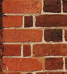 The bricks are laid in Flemish bond both in the water table and the walls and show occasional use of glazed brick in both headers and stretchers. The walls are 22" thick. Queen closers and rubbed brick are present at the corners, compass windows, and doorways. The transition from the water table to the walls is via an ovolo, or convex, molded brick. It is a large, deep church as already stated, approaching the limit of audibility in its 83-foot length. The modillion cornice, large toothed decorated eaves, are probably of colonial origin.[11]