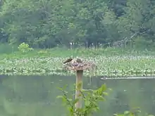 Little Hunting Creek is home to wildlife. Migratory birds such as mallards, Canada geese, great blue herons, and great egrets are common sights along the creek. Ospreys nest there, usually on top of a post in the creek. Bald eagles have been spotted in the area. Muskrats and the occasional beaver have been seen in Little Hunting Creek, and groundhogs and foxes can be found in the woods near the water. Fish such as catfish, carp, perch, and largemouth bass are found in the creek.[13] In 2004, Little Hunting Creek became one of the first places where invasive northern snakehead fish were caught near the Potomac.[14]