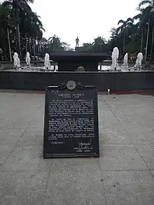 During the Spanish colonial times, the land that is now Liwasang Bonifacio and the Manila Central Post Office was the Cuartel del Fortín, a small fortress guarding the Pasig River east of Fort Santiago. It was located in the early Chinese trading village of Parián right outside the walls of Intramuros before it moved north of the Pasig River to Binondo and Santa Cruz in the late 18th century. El Fortín served as the quarters of a contingent of the Spanish infantry regiment where it is fronted by a small plaza surrounded by stone benches and trees. The Plaza del Fortín also doubled as a public recreation area at night where early residents would gather to hear musical performances.[2] By the late 19th century, the fortress was acquired by the Compañía General de Tabacos de Filipinas and was converted into a factory called the Fabrica del Fortín. It was the largest tobacco factory in the Philippines at the time which employed more than 5,000 laborers.[3] After the Spanish–American War, the factory became the head office of the Bureau of Post and was eventually replaced by the Manila Central Post Office building.[4] The Manila tranvía had a terminal in the plaza which was then renamed Plaza Lawton after Henry Ware Lawton, the American general killed during the Philippine–American War. A statue of Andres Bonifacio was erected here in 1963 designed by national artist Guillermo Tolentino to commemorate his birth centennial.[5] It was also in 1963 when Plaza Lawton was renamed Liwasang Bonifacio in his memory.