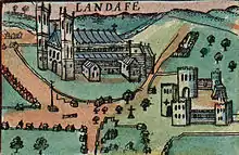 5. The 1719 Browne Willis account described the Bishop's Palace as being southeast of the cathedral and as a very stately building, judged from the gate house, which was still standing in its entirety in 1719. The site of the Bishop's Palace itself was a garden in 1719.[27] There was also an Archdeaconal Castle for the Archdeacon of Llandaff on the cathedral property; it was destroyed at the same time as the Bishop's Palace.[28] Another account says the Bishop's Palace and the Archdeacon's Castle were both burned to the ground.[29]