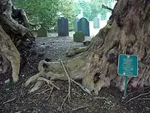 This yew tree lives in the churchyard of St. Digain's Church in Llangernyw village. Although it is very hard to determine the age of yew trees,[2][3] the churchyard gate holds a certificate from the Yew Tree Campaign in 2002, signed by David Bellamy, which states that "according to all the data we have to hand" the tree is dated to between 4,000 and 5,000 years old. David Bellamy used the same methods as he did when establishing the age of the Tisbury Yew in Wiltshire, including radiocarbon dating.[4] A carved stone board by the tree itself also confirms that estimate and also puts the age of the tree at 4000-5000 years, which would make the Llangernyw Yew one of the oldest non-cloning trees in the world, potentially rivalling Methuselah in California and even the Fortingall Yew in Scotland. It has, however, been claimed that the Defynnog yew from the Brecon Beacons surpasses the Llangernyw Yew in age, although an investigation into its age does not support that claim.[5] There is an alternative theory that presumes the tree is only as old as the adjacent saint site, which would make it around 1,500 years old.[6][7][8]