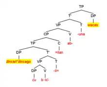 The syntax tree shows that the antecedent and logophoric pronoun in (a) are co-referential across a clausal boundary. Notably, logophoric pronouns such as may occur at any level of embedding within the same sentence. Additionally, if the antecedent is already established previously within the discourse, the antecedent with which the logophoric pronoun has a co-reference relation need not be in the same sentence.[1]