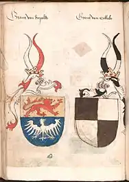 Inverted coat of arms of the Counts of Diepholz (cited as Graue von Diepoldt) (on the left) in the Wernigerode Armorial (ca. 1475-1500).