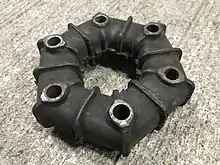 The final drive used four Rotoflex couplings[lower-alpha 1] to connect the differential output shafts to the rear hubs. These "rubber doughnut" couplings were widely used at the time for road vehicles (e.g. Hillman Imp, Triumph GT6) and racing (e.g. Ford GT40, Lotus 21), prior to the availability of constant velocity (CV) joints. In the case of the Elan, which had exceptionally supple rear suspension that allowed significant vertical wheel travel, the deformation of the Rotoflexes in operation resulted in some "wind up" of the couplings. This could be readily detected by the driver, especially at takeoff and during gear changes, and was slightly disconcerting when driving an Elan for the first time. In practice drivers typically adjusted their clutch technique within a few minutes and no longer noticed it. In recent years the uncertain quality of replacement Rotoflex couplings, combined with the availability of half-shafts built with CV joints, has resulted in many Elans being converted from Rotoflex to CV joint drive.