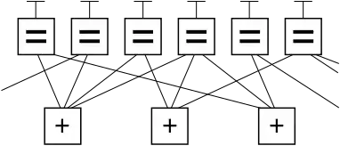 This is a popular way of graphically representing an (n, k) LDPC code. The bits of a valid message, when placed on the T's at the top of the graph, satisfy the graphical constraints. Specifically, all lines connecting to a variable node (box with an '=' sign) have the same value, and all values connecting to a factor node (box with a '+' sign) must sum, modulo two, to zero (in other words, they must sum to an even number; or there must be an even number of odd values).