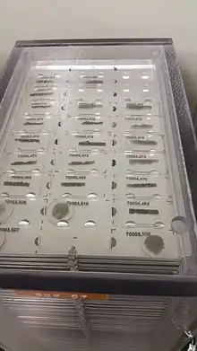 The facility is the chief repository of the samples returned by the Apollo program.[5] The Apollo missions to the lunar surface (Apollo 11, Apollo 12, Apollo 14, Apollo 15, Apollo 16, and Apollo 17) returned a total of 382 kilograms (842 pounds) of lunar rocks, core samples, pebbles, sand and lunar surface dust, comprising 2200 individual specimens. Seventy-five percent of the lunar materials returned by Apollo are housed at the Lunar Sample Laboratory Facility, most in pristine condition.[3] Some of the materials have been processed into smaller samples to meet scientific requirements, resulting in more than 110,000 individually cataloged samples.[6]
