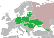 Lustration map of Europe, with green representing some form of lustration; pink no lustration; and grey not a former Warsaw Pact member