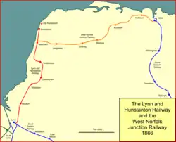 The West Norfolk Railway was allied with the Lynn and Hunstanton Railway, and they amalgamated by Act of 8 June 1874, becoming the Hunstanton and West Norfolk Railway.[5][1] The Lynn and Hunstanton main line was relatively successful but smaller railways became more fragile in the latter decades of the 19th century, and on 1 July 1890 the Lynn and Hunstanton Railway was sold to the Great Eastern Railway for £160,000 and £5,000 for legal expenses.[3][1]