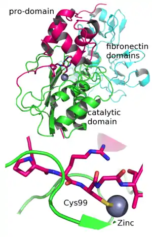 - ↑ Ramos-DeSimone N, Hahn-Dantona E, Sipley J, Nagase H, French DL, Quigley JP (May 1999). "Activation of matrix metalloproteinase-9 (MMP-9) via a converging plasmin/stromelysin-1 cascade enhances tumor cell invasion". The Journal of Biological Chemistry. 274 (19): 13066–76. doi:10.1074/jbc.274.19.13066. PMID 10224058.