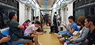 Each train car has a capacity of 394 passengers. A 3-car trainset can accommodate 1,182 passengers.[12] Two wheelchair-compatible spaces are provided beside the driver cab of each LRV, each provided with seatbelts to prevent the wheelchair from moving around while the train is in motion. The sides of the doors are equipped with fire extinguishers. The trains also have an equipped passenger emergency alarm button in case of an emergency.[25]