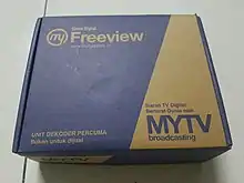 MYTV Broadcasting Sdn. Bhd. or simply MYTV is a Malaysian television broadcasting private company providing free digital terrestrial television (DTT) in the country, considered a first of its kind in the country.[1] The DTT service is officially branded as myFreeview since August 2015, though the legal name of the company remained unchanged[2] A billion MYR deal have been signed with Telekom Malaysia to distribute the services.[3] The set top box has been available for sale as of February 2017, after long delays of building infrastructure and other issues.[4][5][6][7]
