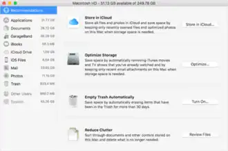 iCloud Drive can upload the user's documents and desktop directories and sync them to other devices. The System Information application has a new section that gives the user detailed information about space usage per application or file and provides tools and suggestions for freeing up space. For instance, the user can let the system upload old files to iCloud Drive and remove their local copies, keeping them available on-demand in Finder. It can also remove old files from trash automatically. iTunes can delete watched, purchased films and TV programs from its library.[12][13]