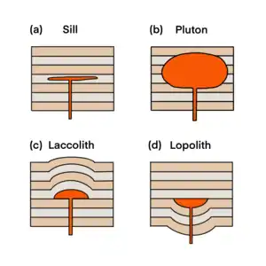 Shape of different magma emplacement structures: (a)sill, (b) pluton, (c) laccolith and (d) lopolith.[4] Sills are tabular sheet intrusions. Plutons are large, thick tabular bodies. Laccoliths are dome-shaped structures with elevate roofs and flat floors. Lopoliths are lenticular structures with flat roofs and depressed floors.[4]