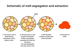 Microscopic view of melt segregation and extraction.[6][7][8] When the source rock experiences compaction, minerals start to melt at grain boundaries. Melt droplets then build up and connect into melt pools until they are being extracted.