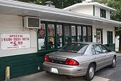 The Maid-Rite Sandwich Shop in Springfield, Illinois, is one of the few remaining early Maid-Rite franchises in the United States. This specific shop, built in 1921, claims to have the first drive-thru window in the U.S.[2] The building, along historic U.S. Route 66, was added to the National Register of Historic Places in 1984.