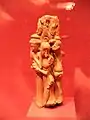 Many human figurines have been found decapitated, suggesting their use as effigies or religious offerings. However, construction techniques may also have rendered them fragile. Another explanation is that these figurines were secular play objects, cast aside once broken.[7] Commonly the figurines are small, measuring and constructed by the coil and pinch methods with carved or incised decorations, a forming method that is sculptural.[8] Other figurines are made by moulding, as is the figure in the first image two images below. This is an unusual example in that there is no fracture line at the neck. The variety of expression is infinite with naturalistic postures and facial expressions. Complete figurines are rare compared to the many headless figures or heads without bodies. They often take the form of a woman sitting in a polite female pose, on her calves with her feet tucked underneath.[9] The figure on the Right is complete. The second figurine the head has been separated but the two fragments were found together. She sits holding something to her chest. This is either a talam or offering tray, or as Kunst (1927) thought, it may be a drum.[10] The third figurine is sitting and playing what can clearly be seen as a musical instrument. Next to her is a figurine with a red slip around her neck, presumably where at the place where the head would be separated. The reason for there being so many heads without bodies is unknown but it is speculated that the figurines were possibly decapitated in a ritual offering.[9]