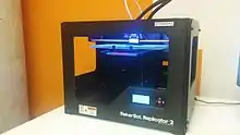 MakerBot Industries, LLC was an American desktop 3D printer manufacturer company headquartered in New York City. It was founded in January 2009 by Bre Pettis, Adam Mayer, and Zach "Hoeken" Smith to build on the early progress of the RepRap Project. It was acquired by Stratasys in June 2013. As of April 2016, MakerBot had sold over 100,000 desktop 3D printers worldwide.[1] Between 2009 and 2019, the company released 7 generations of 3D printers, ending with the METHOD and METHOD X.[2] It was at one point the leader of the desktop market with an important presence in the media, but its market share declined over the late 2010s.[3][4][5] MakerBot also founded and operated Thingiverse, the largest online 3D printing community and file repository.[6] In August 2022, the company completed a merger with its long-time competitor Ultimaker. The combined company is known as UltiMaker, but retains the MakerBot name for its Sketch line of education-focused 3D printers.[7]