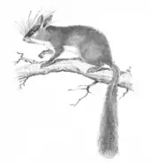 This rodent is about 5 in long with a 4-in tail. The ears are large and pointed at the tip. The whiskers are numerous and some are very long. The hairy tail is covered with longer hairs towards the end, making the tail wider at the tip. The hairs arise on the sides towards the base of the tail (an arrangement termed as "subdistichous") giving the tail a slightly flattened appearance. The pollux ("thumb") and hallux ("big toe") are without claws. The skull is broad and flat above and the infraorbital foramen is large. They are brownish above and whitish below with a distinct border. The feet are whitish. The tip of the tail is sometimes whitish, but is otherwise like the colour of the back.[2] The fur on the back has scattered broad and flat spiny hairs with white tips.[3] Finer spines are also found on the fur of the underside.[4]