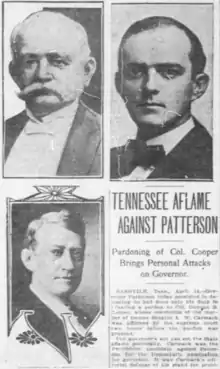 Shortly after the election, Patterson became involved in a scandal that would eventually end his political career.[5] Carmack, his former opponent, had published an article ruthlessly mocking Patterson's advisor, Colonel Duncan Cooper. On November 8, 1908, Cooper and his son, Robin, encountered Carmack in the street. Gunfire erupted between Carmack and Robin Cooper, killing the former and injuring the latter. Carmack's supporters blamed Patterson for the shooting, and at one point sought his impeachment. Both Coopers were convicted of murder, though the elder Cooper was pardoned by Patterson in 1910, leading to widespread outrage. Patterson, who had issued more than 1,400 pardons during his tenure, had previously been accused of abusing the pardon power to free corrupt political allies.[1]