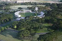 The cemetery, 152 acres (62 ha) or 615,000 square metres in area, is located on a prominent plateau, visible at a distance from the east, south and west.[2] With a total of 17,206 graves, it has the largest number of graves of any cemetery for U.S. personnel killed during World War II and holds war dead from the Philippines and other allied nations.[2] Many of the personnel whose remains are interred or represented were killed in New Guinea, or during the Battle of the Philippines (1941–42) or the Allied recapture of the islands.[2] The headstones are made of marble which are aligned in eleven plots forming a generally circular pattern, set among a wide variety of tropical trees and shrubbery.[2] The Memorial is maintained by the American Battle Monuments Commission.
