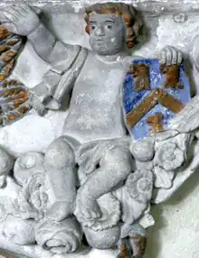 Robert Cary (died 1586) of Clovelly, 4th son of his father, by his 3rd wife. He was given Clovelly by his father.[38] He was the first Cary to be seated exclusively at Clovelly, the manors of Cary and Cockington having been inherited by his half-brothers. He was Member of Parliament for Barnstaple, Devon, in October 1553 and served as Sheriff of Devon in 1555–56. He served as Recorder of Barnstaple after 1560.[39] He was a magistrate and along with several other members of the Devonshire gentry then serving as magistrates he died of gaol fever at the Black Assize of Exeter 1586. He married Margaret Milliton, daughter of John Milliton and widow of John Giffard of Yeo in the parish of Alwington, North Devon. His large monument, with strapwork decoration, survives against the south wall of the chancel of All Saints Church, Clovelly. Along the full length of the cornice is inscribed in gilt capitals: Robertus Carius, Armiger, obiit An(no) Do(mini) 1586[40] ("Robert Cary, Esquire, died in the year of Our Lord 1586"). On the base of the north side are shown two relief sculpted heraldic escutcheons, showing Cary impaling Chequy argent and sable, a fess vairy argent and gules[41] (Fulkeram, for his father) and Cary impaling Sable, three swords pilewise points in base proper pomels and hilts or (Poulett, for his grandfather). On the base of the west side is a similar escutcheon showing his own arms of Cary (of four quarters, 1st: Cary; 2nd: Or, three piles in point azure (Bryan);[42] 3rd: Gules, a fess between three crescents argent (Holleway);[43] 4th: A chevron (unknown, possibly Hankford: Sable, a chevron barry nebuly argent and gules[44]) impaling Gules, a chevron or between three millets hauriant argent (Milliton[45])