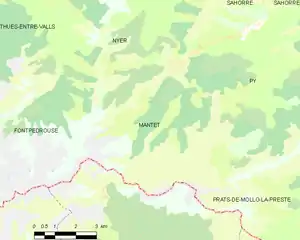 Mantet is located in the canton of Le Canigou and in the arrondissement of Prades.