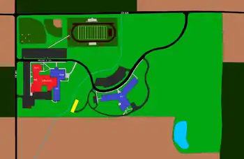 All three of the Mapleton buildings are located on one campus at the southeast corner of County Roads 801 and 620, about 3 miles north of Nankin, Ohio.[7] Mountie Drive runs through campus and connects CR 801 with CR 620 after winding by all three buildings. Despite Mountie Drive serving as the mailing address for the high school[8] and the elementary school,[9] the middle school still uses CR 801 for its address.[10]