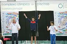 Marcus Titus's swimming career began when he first decided to join his high school swim team at Flowing Wells. He continued swimming throughout all of high school career and eventually continued on with it throughout college when he attended the University of Arizona. He is the Arizona State University and University of Arizona 100 yard breaststroke record holder. With the help of his coach, Frank Busch, Titus made the USA National team three years in a row gaining him recognition.[1] During the Pan American Games, Titus won his medal in the 100-meter breaststroke in Guadalajara, earning his first ever medal it an international competition. This along with all the other big events he has attended and placed well, such as NCAA's, US Open, and the Olympic trials has helped to make him one of the most renowned deaf swimmers in United States.[4]