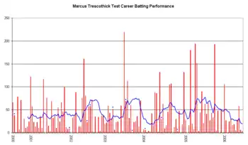 The following five years were mixed for Trescothick. Averaging about 30 runs per innings, he was often criticised for a lack of foot movement. David Gower described Trescothick's technique by saying "he does not need to move a long way but needs to move enough. When he is playing well ... he is very good at transferring weight. When he is not playing well, his feet get stuck".[29] However, Trescothick was awarded the NBC Denis Compton Award for Somerset's most promising young county player in the 1996 and 1997 seasons.[2] In 1997, Somerset Second XI were set 612 to win by Warwickshire Second XI, and Trescothick scored 322 to bring the Seconds to 605.[30]