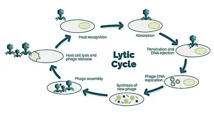 The lytic cycle, the reproductive cycle of the bacteriophage, has six stages: