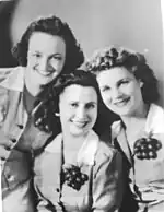 In 1943, Marjorie joined the USO to help the war effort as part of the show highlighted by Roy Smeck, the anointed "King of the Ukulele." She was the lead singer of a swing trio called the Meri-Maids, all Wisconsin girls, that also featured Ruth Sanfheil and Mary Rumachick. They toured extensively in military hospitals in the United States throughout the war. They primarily sang songs popularized by the Andrews Sisters[13] and Barn Dance favorites the Dinning Sisters.[14] These songs are still popular, being sung by such artists as Bette Midler[15] and Katy Perry.[16] Later, the Dinning's younger brother Mark Dinning had the number one hit, co-written by Jean Dinning, Teen Angel.[17]