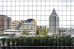 The glass windows of The Market Hall with in the background the Rotterdam Library (left) Blaak Tower (middle) and the cube houses (right).