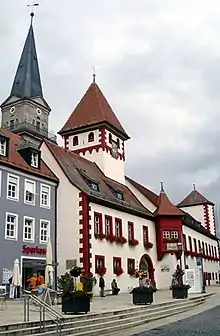 Marktredwitz (German: [maʁktˈʁɛt.vɪt͡s] ) is a town in the district of Wunsiedel, in Bavaria, Germany, close to the Czech border, 22 km west of Cheb, 50 km east of Bayreuth and 50 km south of Hof/Saale. Marktredwitz station is at the junction of the Nuremberg–Cheb railway and the Munich–Hof railway. It celebrated the Horticultural Show 2006 in cooperation with Cheb.